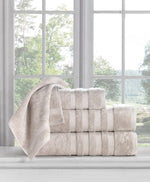 Luxurious silk woven 4 piece bath towel set includes 2 large bath towels 1 matching hand towel and washcloth with neutral colors to refresh, decorate, and update your bathroom for guests and family. Silk woven towels blended with 100% Turkish cotton for a luxurious, soft and absorbent towel. Combed cotton helps add loft for a thick but weightless towel!  Energy efficient lightweight towels make it easy for fast drying! Easy care and machine washable.  Durable and heavy duty! Long lasting premium cotton fibers with double stitching at the hem to prevent shrinkage and fraying.